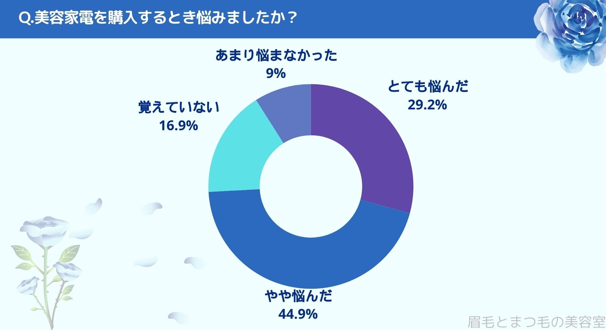 美容家電を購入するときに悩んだかお聞きしたところ「とても悩んだ(29.2%)」、「やや悩んだ(44.9%)」、「覚えていない(16.9%)」、「あまり悩まなかった(9%)」という結果になりました。