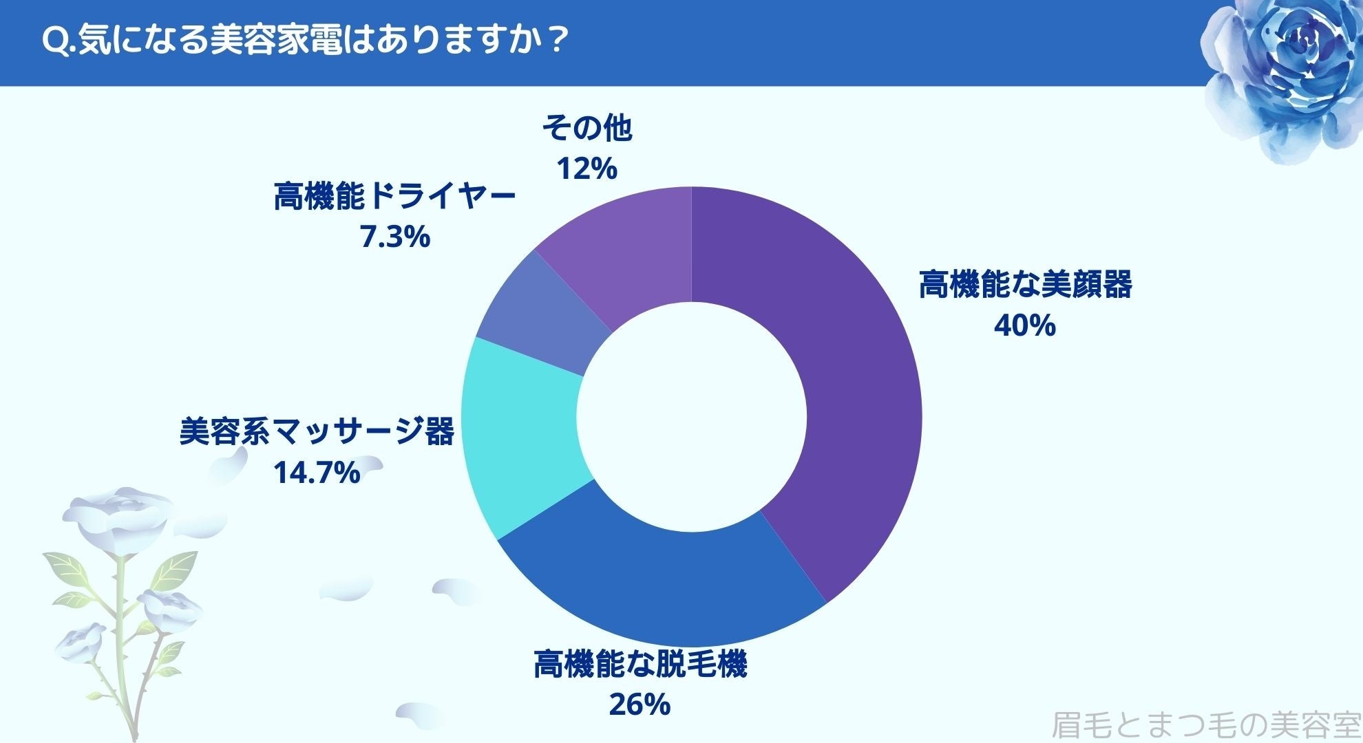 気になる美容家電をお聞きしたところ「高機能な美顔器(40%)」、「高機能な脱毛機(26%)」、「美容系マッサージ機(14.7%)」、「高機能ドライヤー(7.3%)」、「その他(12%)」という結果になりました。