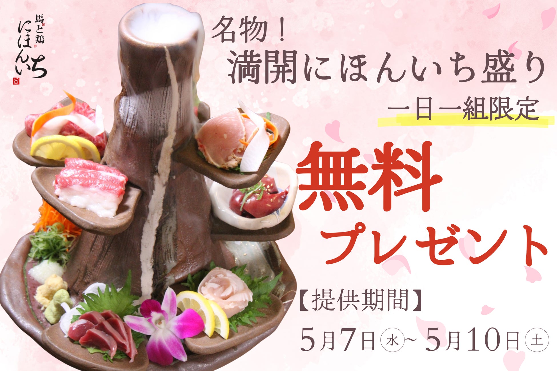 株式会社N・I(エヌアイ、本社:大阪府大阪市淀川区、代表取締役:河村 則夫)の運営する『純国産馬刺しと朝引き鶏 にほんいち』大阪堺筋本町店は、2025年5月7日(水)~同年5月10日(土)までの期間中、名物商品"満開にほんいち盛り"を1日1組様に無料プレゼントいたします。