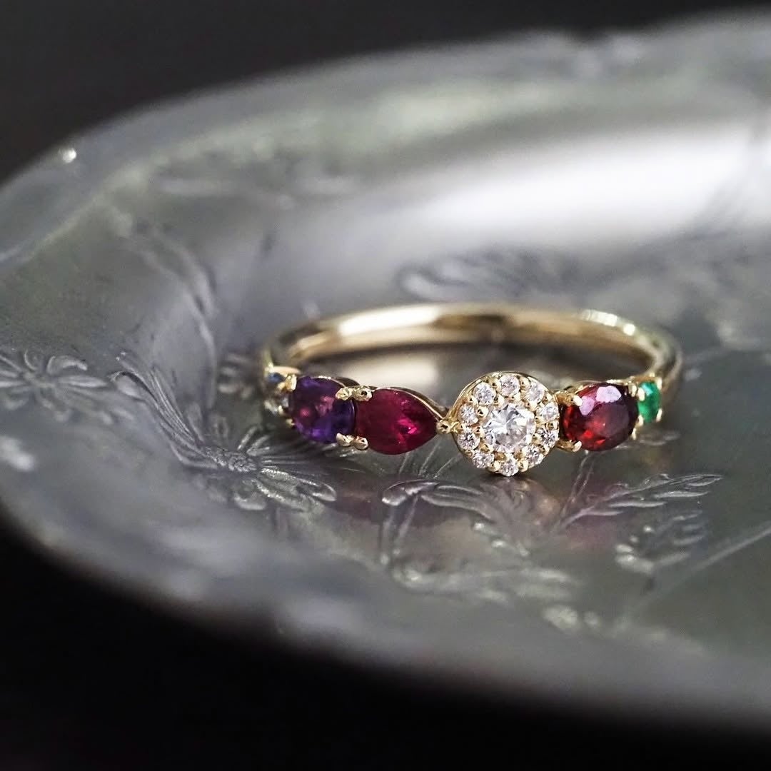 「ファミリー配色」とは、ご家族それぞれの誕生石を組み合わせ、リング全体で「家族の絆」や「思い出」を表現するデザインです。お子様の誕生石、ご両親、兄弟姉妹の誕生石を取り入れることで、かけがえのない想いを込めた「ファミリーリング」が完成します。家族の誕生石を選びながら、それぞれの個性や関係性を反映させた組み合わせは、身に着ける人にとって特別な意味を持ち続けます。