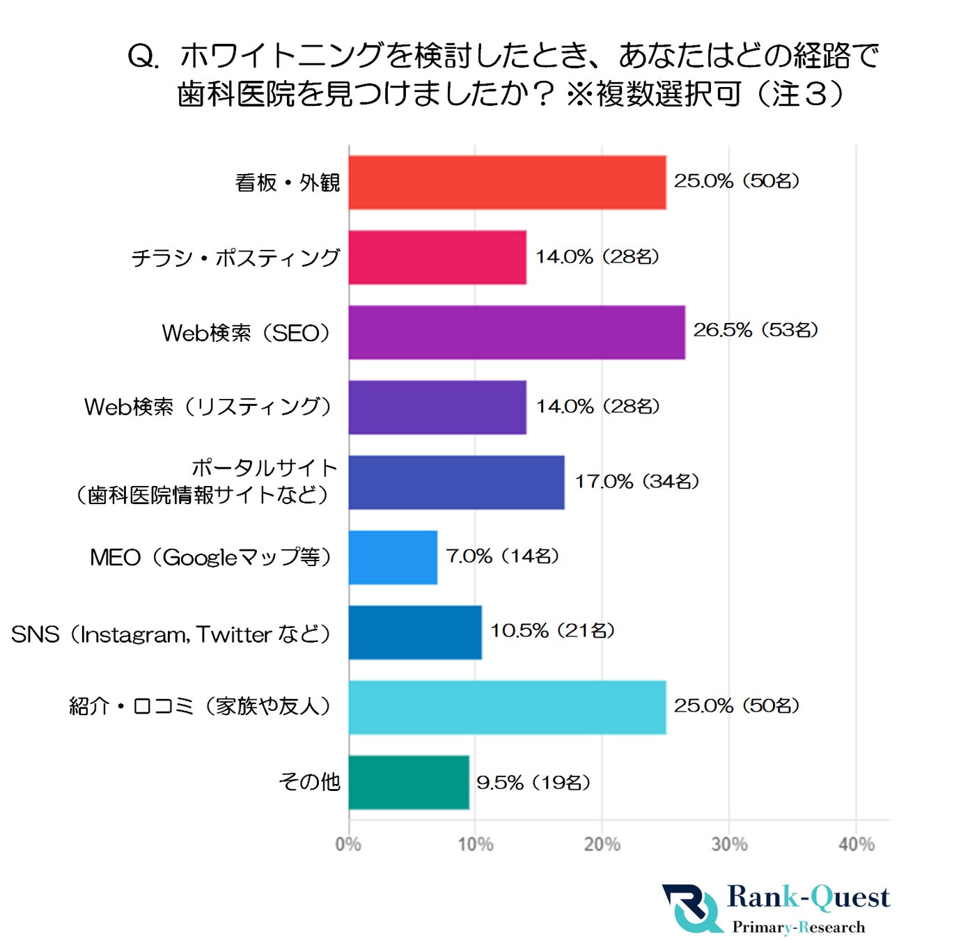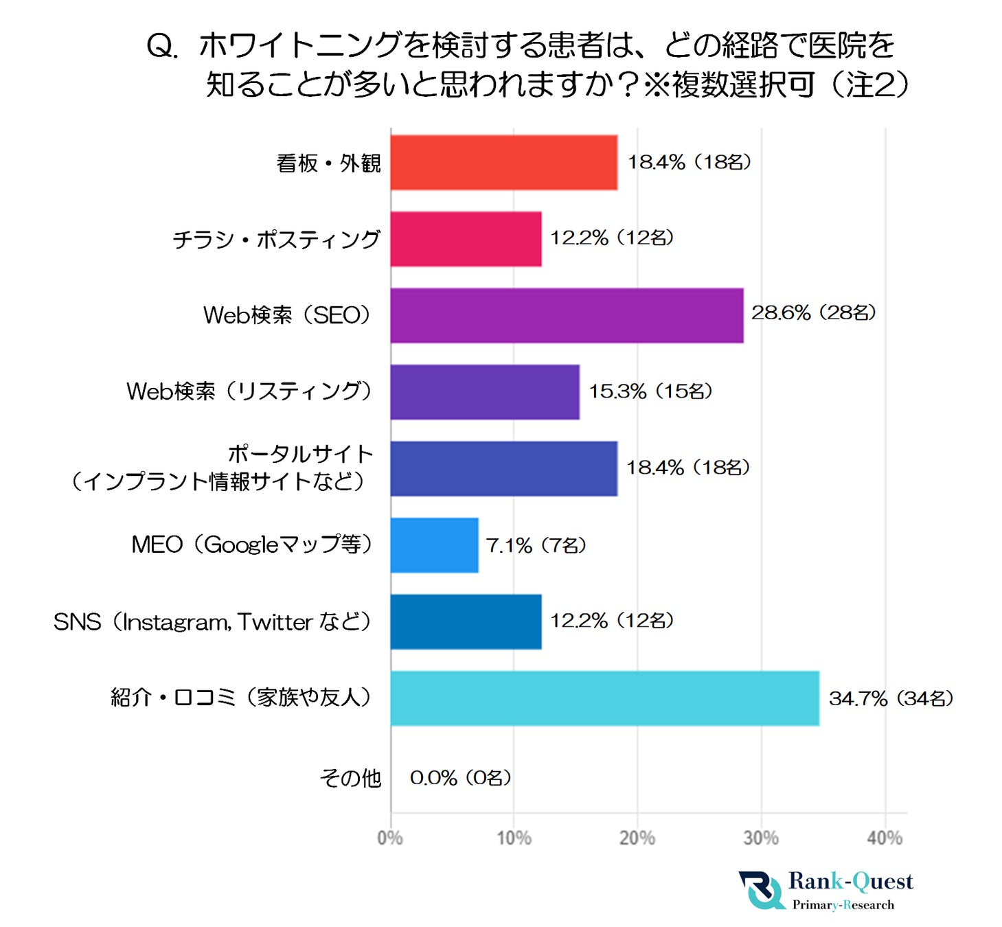 そこで【SEO対策】で検索順位No.1を獲得した実績(注1)を持つランクエスト(https://rank-quest.jp/column/column/how-to-seo/ )はホワイトニングを提供する独立開業歯科医師98名と、実際に治療を受けた患者200名を対象に、医院を知ったきっかけ(認知経路)について調査を実施しました。