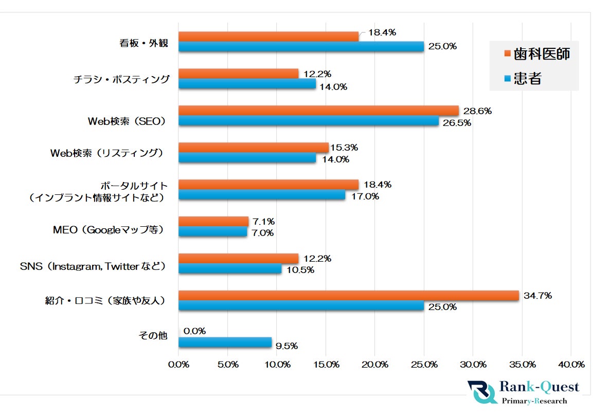 SEO(自然検索)を通じた認知については、歯科医師側と患者側でほぼ同じ水準となっています。これはインターネット検索が歯科医院を知るための主要な経路の一つとして、双方に広く浸透していることを示しています。