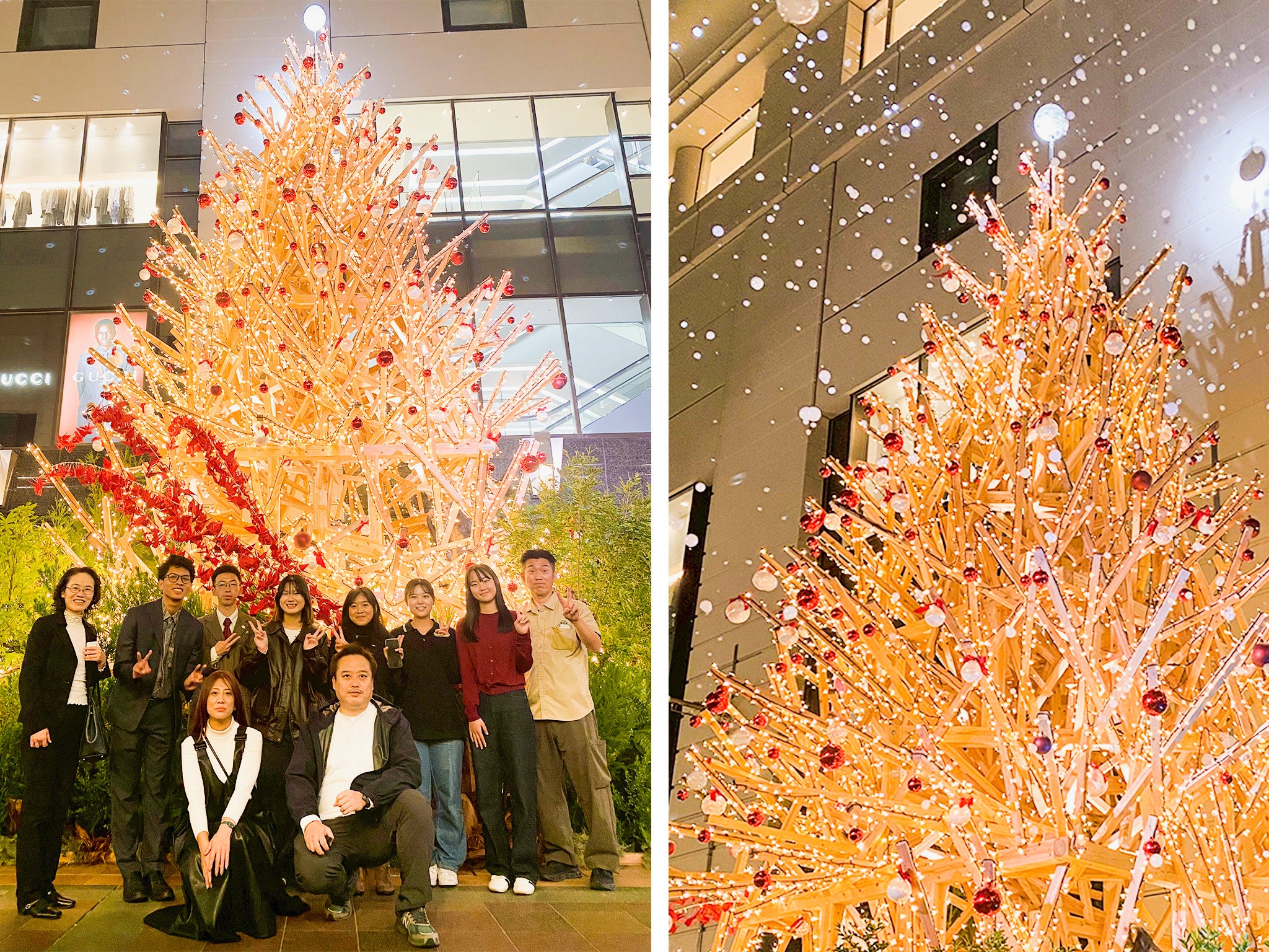 今年のクリスマスツリーは、大分の自然共生サイト「田島山業」が山林保全の一環として伐採した間伐材を活用。森の資源を無駄にしない循環のデザインとして、木の温もりを生かしたツリーが制作されました。灯りが重なるたび、森のいのちが“光”として未来へ受け継がれる象徴的なツリーとなりました。