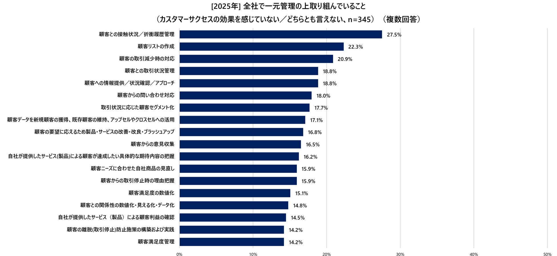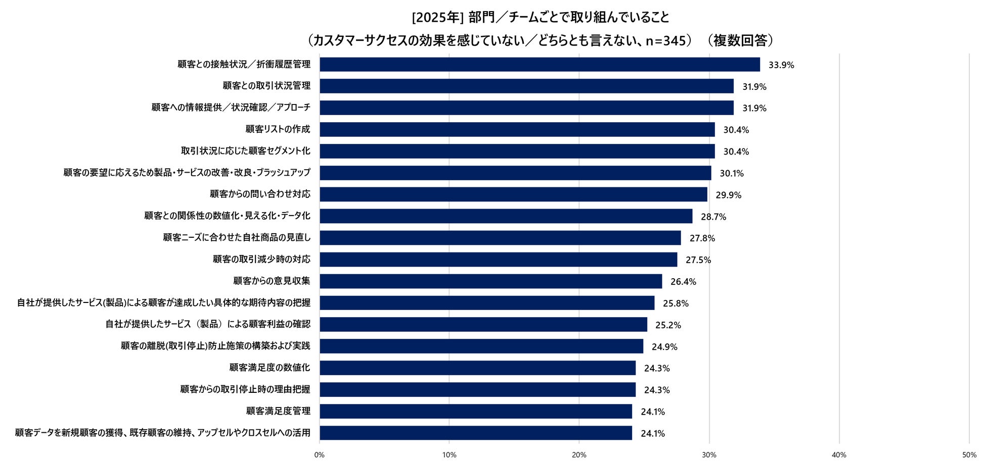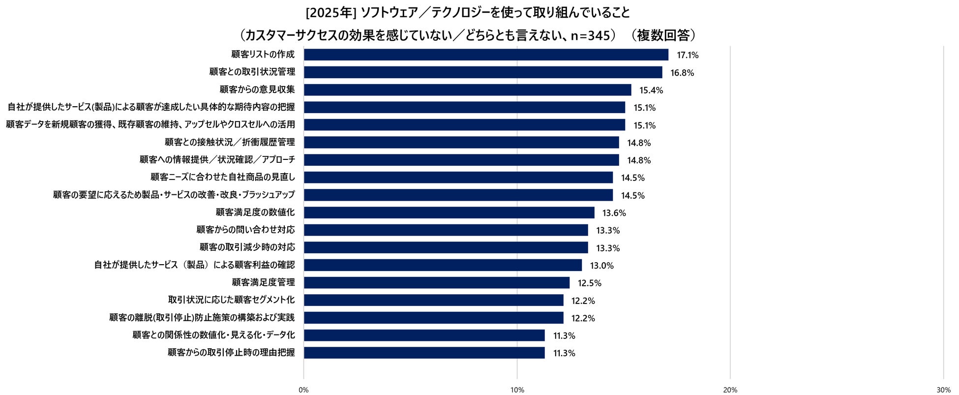 一方、効果未実感層では基本的な顧客管理活動が上位を占めていますが、全体的に効果実感層と比べて実施率が低い結果となっています。高度な分析や戦略的な取り組みの実施率は低く、顧客データの統合管理やプロアクティブな顧客対応の仕組みが十分に整備されていないことがうかがえます。