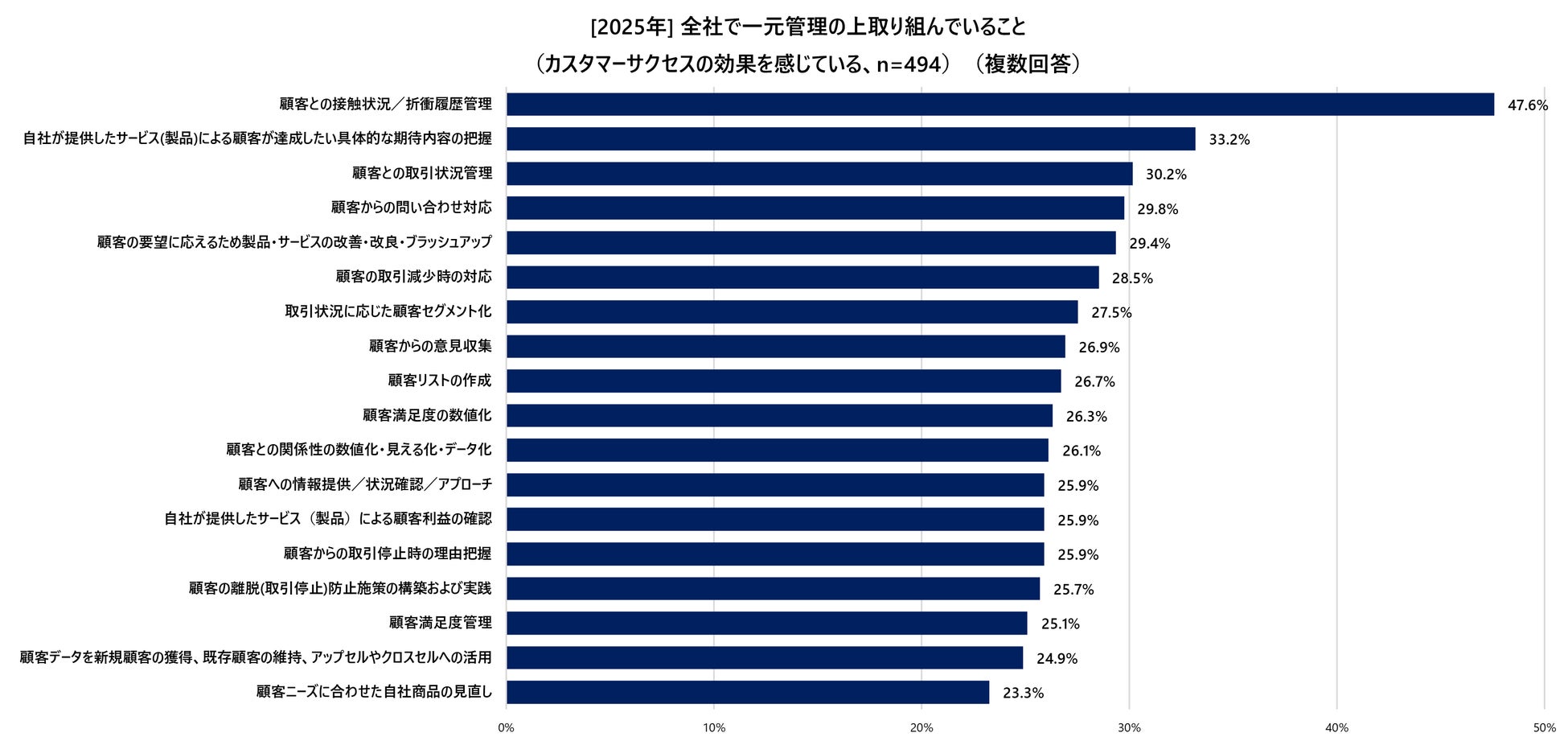 一方で効果未実感層では上位項目として「顧客との接触状況」や「顧客リスト作成」など基本的な項目が挙げられるものの、全体的に全社一元管理の実施率は20%前後にとどまり、効果実感層とのギャップが確認されました。