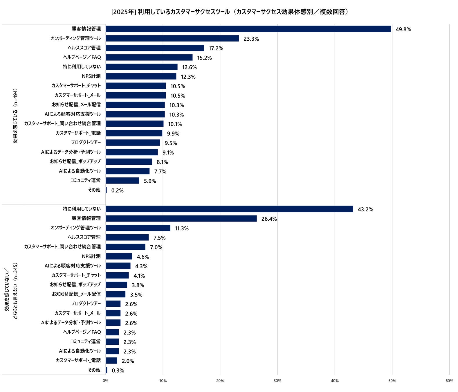 最後に、カスタマーサクセス業務でどのようなツールを利用しているかを見ていきます。効果実感層では、顧客情報管理、オンボーディング管理ツール、ヘルススコア管理などを積極的に導入しており、ツールや仕組みの活用が効果の有無に直結している可能性が高いと考えられます。特に「顧客情報管理」の利用率は効果実感層で約半数にのぼり、未実感層の26.4%を大きく上回っています。また、「オンボーディング管理ツール」「ヘルススコア管理」「NPS計測」なども、効果実感層での導入率が未実感層に比べてほぼ倍の差が見られました。さらに、各種サポートツール(チャット10.5%、問い合わせ統合10.1%など)を複合的に利用する傾向が認められますが、未実感層ではいずれも数%台にとどまっています。加えて、「AIによる顧客対応支援」(実感層:10.3% vs. 未実感層:4.3%)や「AIによるデータ分析・予測」(実感層:9.1% vs. 未実感層:2.6%)といった先進的なツールの利用率でも、効果実感層が2~4倍程度高い結果となっています。AIを使った顧客行動予測や自動応答などを活用している企業は、顧客対応の効率化や解約防止策の強化につながると推測されます。