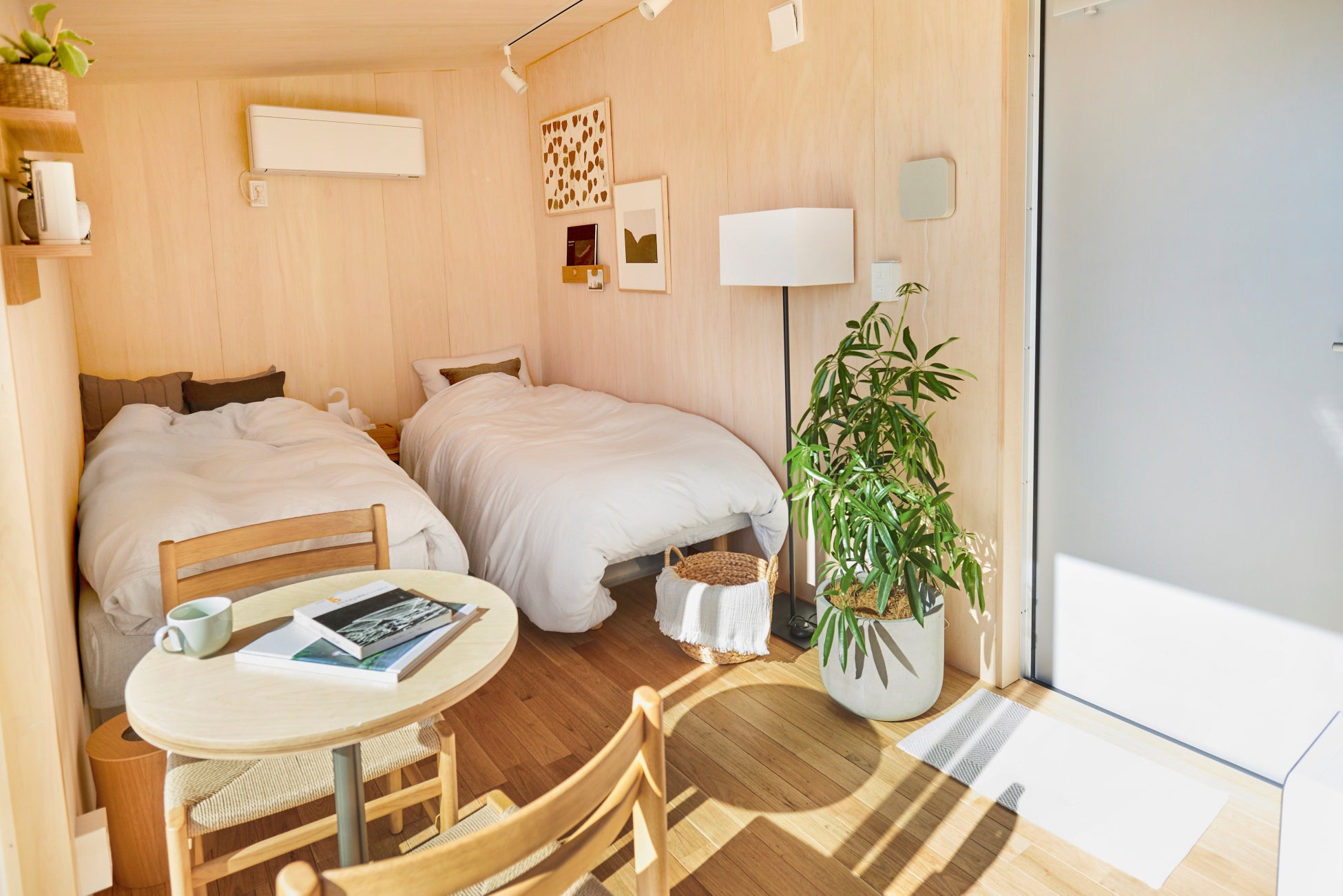リビング棟の室内は約12.15m2(3.68坪)で2人でも快適に過ごせるスペースです。無印良品の脚付きマットレスなら2台並べることができます。また、屋根一体型の太陽光パネルと蓄電池を搭載しており、エアコンや照明などの家電を自由に使うことができます。