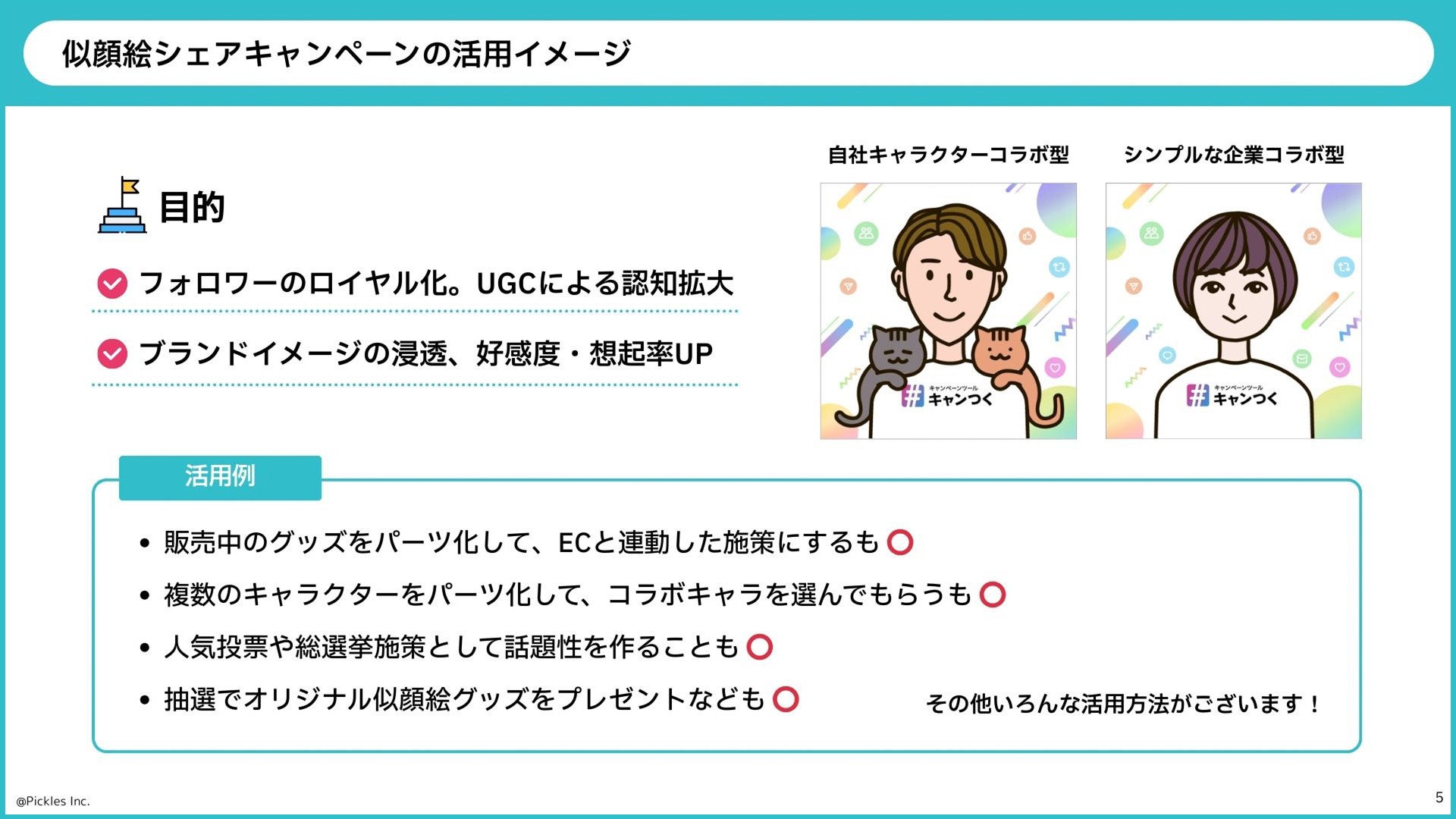 「販売中のグッズをパーツ化して、ECと連動した施策」「複数のキャラクターをパーツ化して、コラボキャラを選んでもらう」「人気投票や総選挙施策として話題性を作る」「抽選でオリジナル似顔絵グッズをプレゼント」...など、様々な活用例が想定されます。