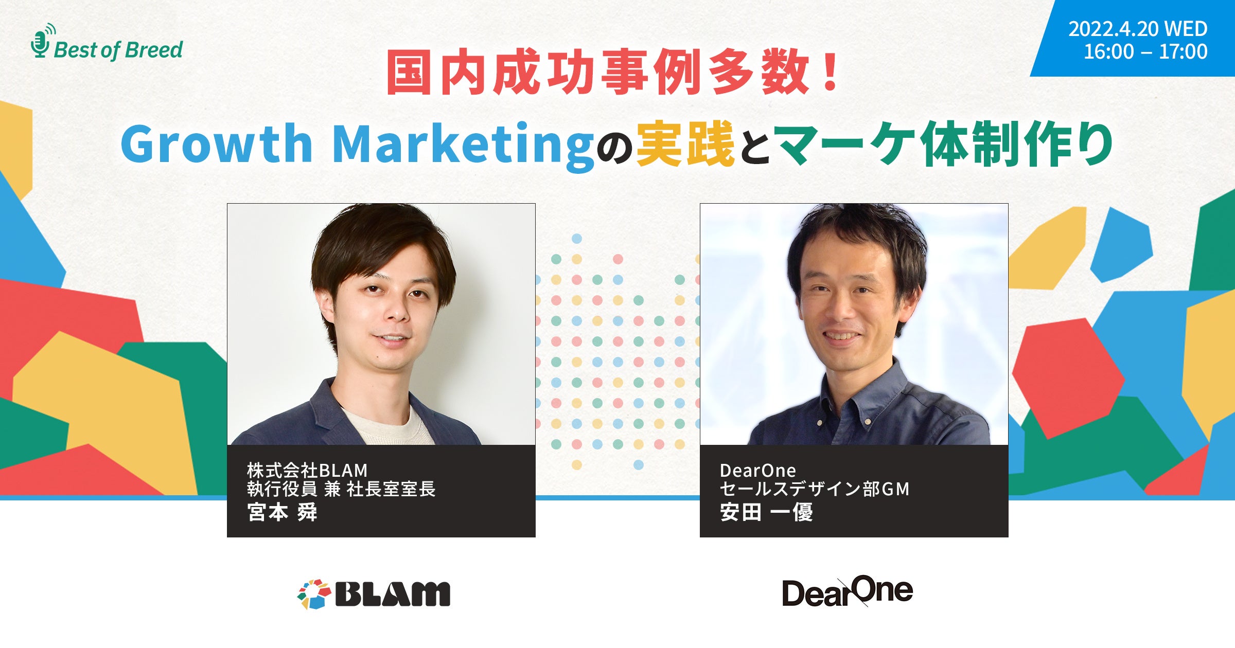 株式会社NTTドコモのマーケティング分野における新規事業型子会社である株式会社DearOne(本社:東京都港区、代表取締役:河野 恭久、以下:DearOne)は、マーケティング領域に特化したプロ複業人材のマッチングサービスを運営し、企業のマーケティングDX支援事業を展開する株式会社BLAMと「グロースマーケティング」をテーマに、2022年4月20日(水)にBest of Breedウェビナーを開催します。