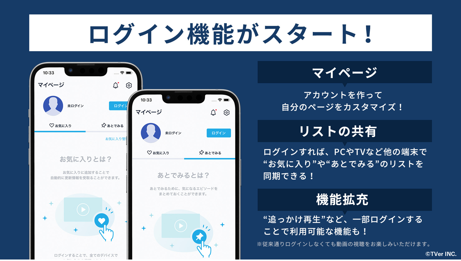 これまでTVerは、ユーザーが利用するデバイス間での連携ができず、個々のデバイスでの視聴状況が分離して管理されておりました。「TVer ID」で各デバイスにログインすると、視聴中のテレビ番組の再生終了位置や、お気に入り番組のリストがデバイスを横断して共有されるので、ユーザーはコンテンツをどのデバイスからでもスムーズに視聴することが可能になります。