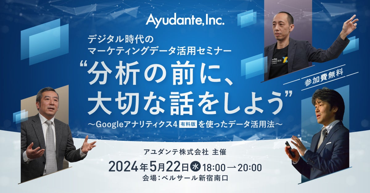 2024年5月22日(水)18時より、デジタル時代のマーケティングデータ活用セミナー”分析の前に、大切な話をしよう”~Googleアナリティクス4有料版を使ったデータ活用法~をテーマに自社セミナーを開催致します。