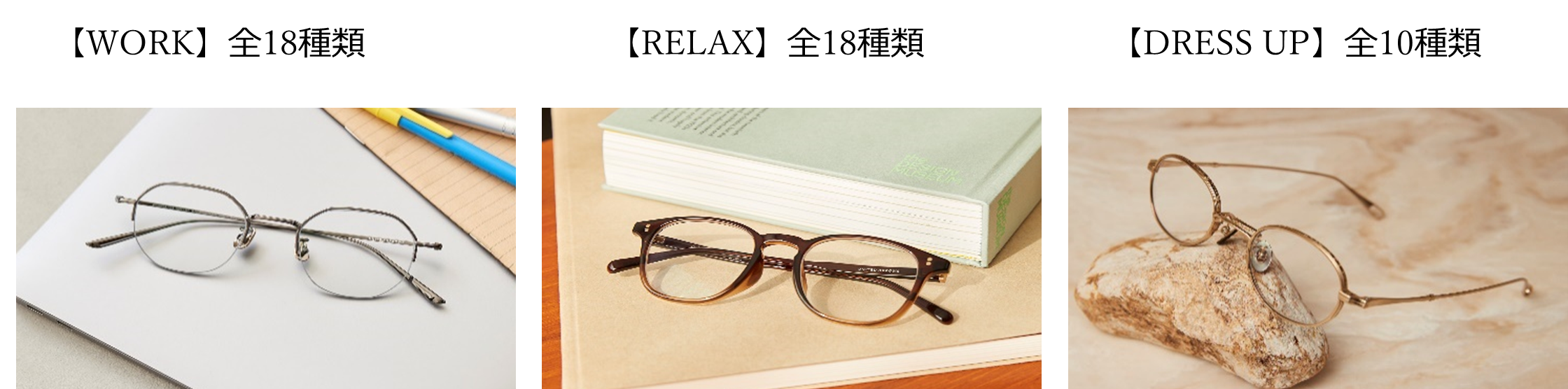 「そのシーンに、似合うメガネを。」をコンセプトに、オンタイムに似合う上品でクラシカルなデザインの「WORK」、オフタイムを快適に過ごすためのシリーズ「RELAX」、〝少し質の良いものに触れたい〟そんな気持ちをかなえてくれる「DRESS UP」がラインアップ。日常を楽しむために、シーンを彩るメガネのかけ替えを提案します。