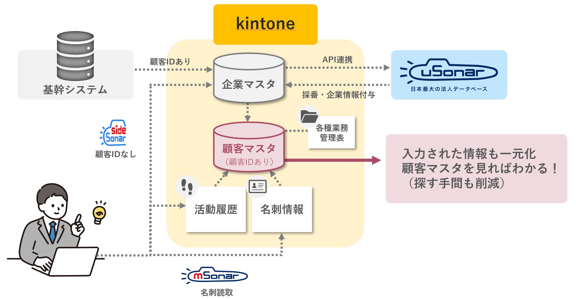 ・異なるシステム間の法人顧客データにユーソナーが共通コードを付番。顧客データの一元管理と蓄積が可能なデータ環境を実現(散在を解消)