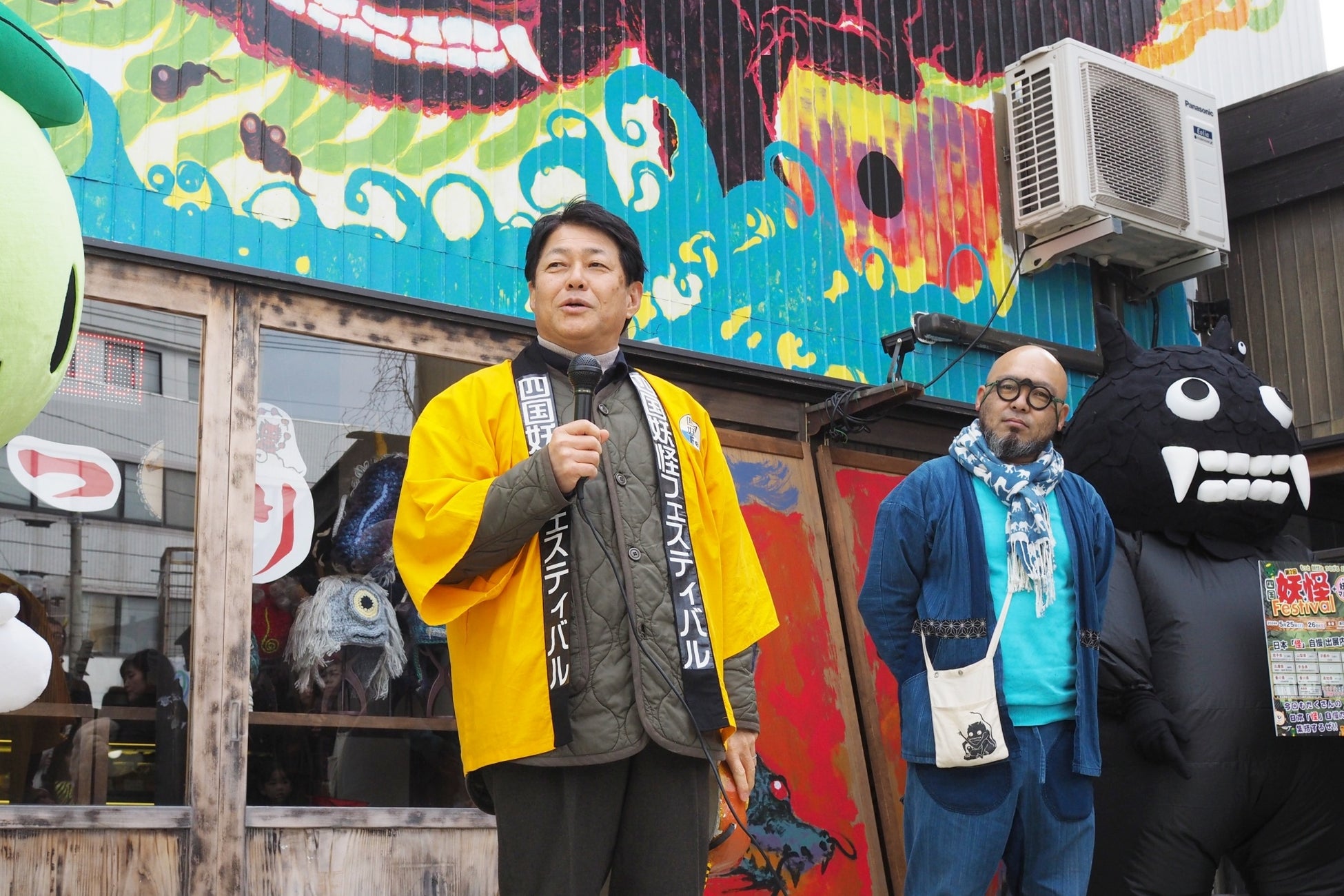 「節分で追い出された鬼たちを匿い労おう」という主旨でこのキャンペーンは2023年から同じ季節に開催してきましたが、今年は節分の翌日に「節分お疲れさま会」というイベントを拡大して開催。愛媛・徳島・兵庫・大阪・福井などから、このイベントを盛り上げるべくラジオパーソナリティやコスプレイヤーや帽子作家なども応援に駆けつけてくださり、大盛況となりました。「鬼を悪者と決めつけず、広い心と多様性を認める大切さ」を伝えるため、香川県観光推進キャラクター「親切な青鬼くん」も登場。こうしたプロモーションにより毎年一番の閑散期である2月の妖怪美術館入館数が例年の約3倍に増加しました。