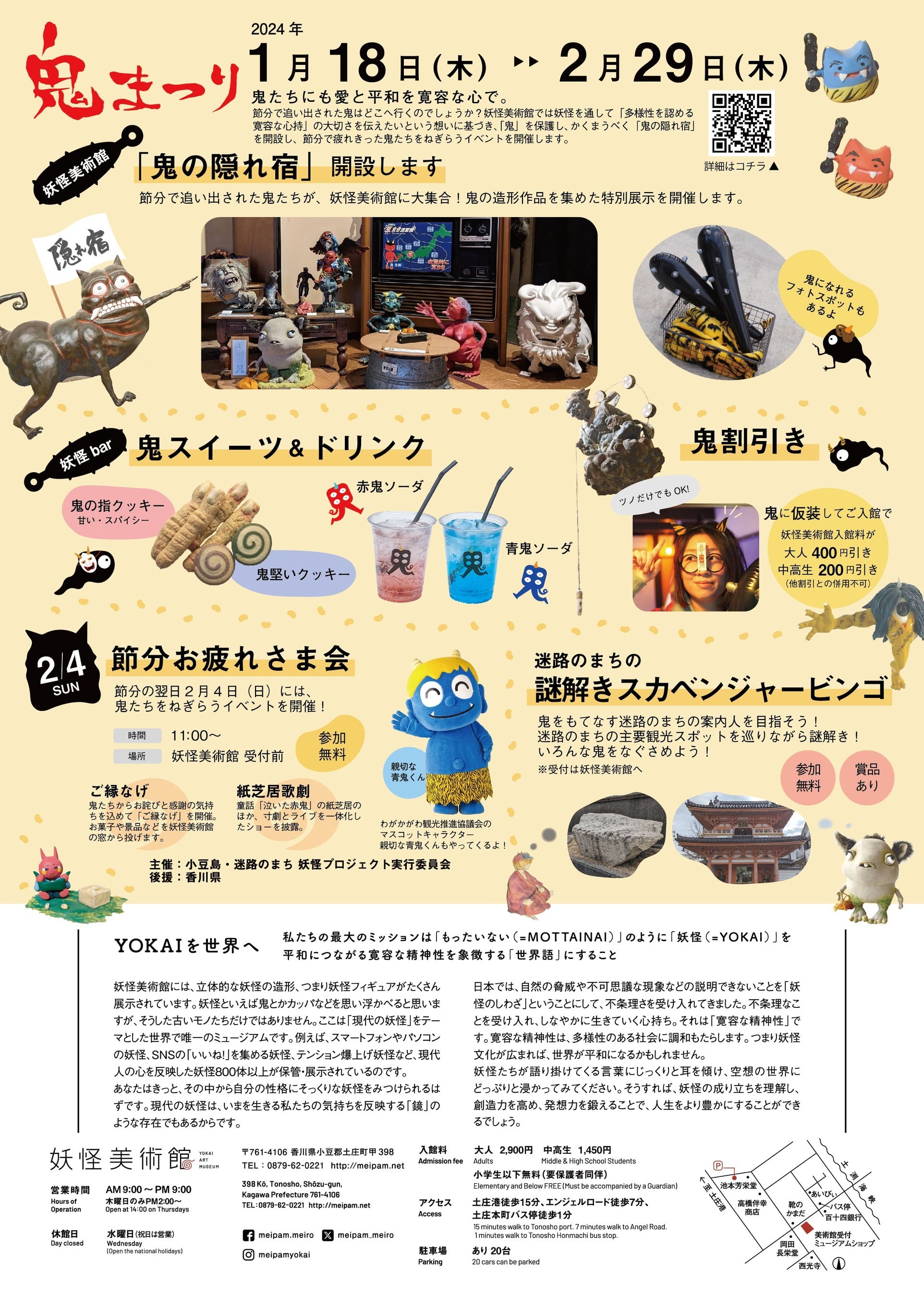 香川県・小豆島の「迷路のまち」(土庄本町)にある妖怪美術館(小豆島ヘルシーランド株式会社)では、観光のオフシーズン(閑散期)に集客を図るため、2024年1月18日(木)~2月29日(木)に「鬼まつり」を開催。鬼の仮装による入館料割引、期間限定の「鬼スイーツ」販売、鬼の造形作品を集めた企画展「鬼の隠れ宿」を実施し、節分の翌日2月4日には鬼たちを労うイベント「節分お疲れさま会」を開催しました。その結果、妖怪美術館の2月の入館者は例年の約3~4倍に増加しました。
