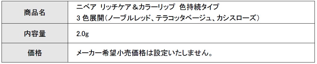 こうした環境の中、カラーリップクリームでのリップメイクの幅をさらに広げたいとの想いから、この度同シリーズから『色持続タイプ』を新発売(*2)いたします。リッチケア&カラーシリーズの保湿効果はそのままに、「発色のよさ」を高め、「色の持続力」をアップした商品です。