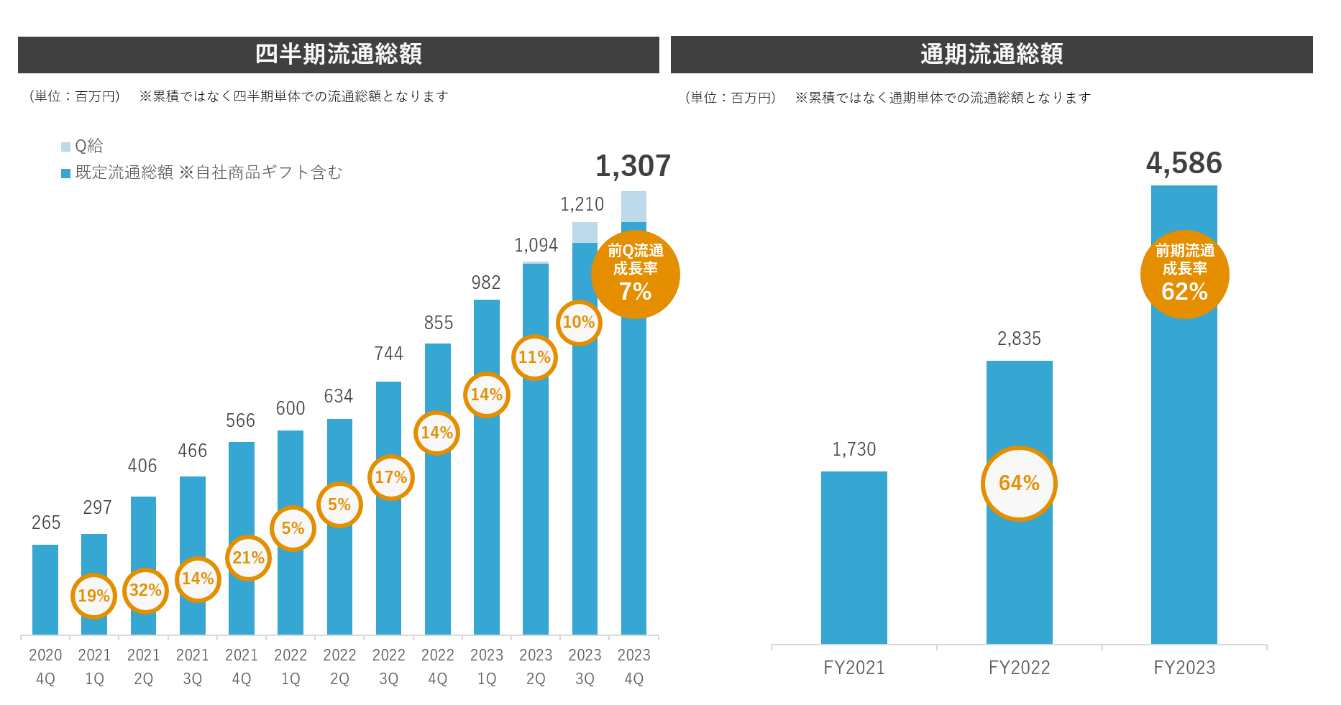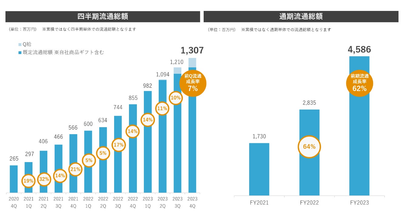 第4四半期流通総額13億円を突破し、14四半期連続成長を実現。2023年9月期流通総額45億、前期比62%成長と堅調に推移