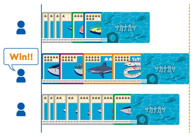 勝敗を決める魚の長さの合計は、カード下の目盛りをつなげて測ります。一番長い人が勝ちです。