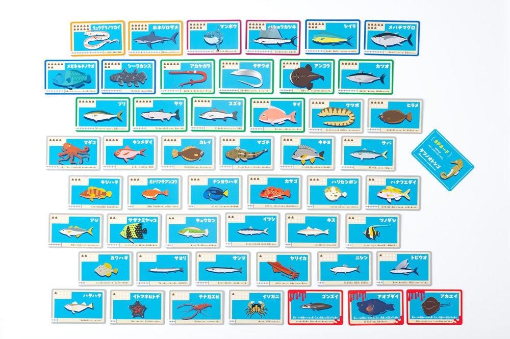 バショウカジキ、メバチマグロ、アンコウ、タチウオ、ホホジロザメなど、海で釣れる魚を中心に魚カードは全部で50枚。