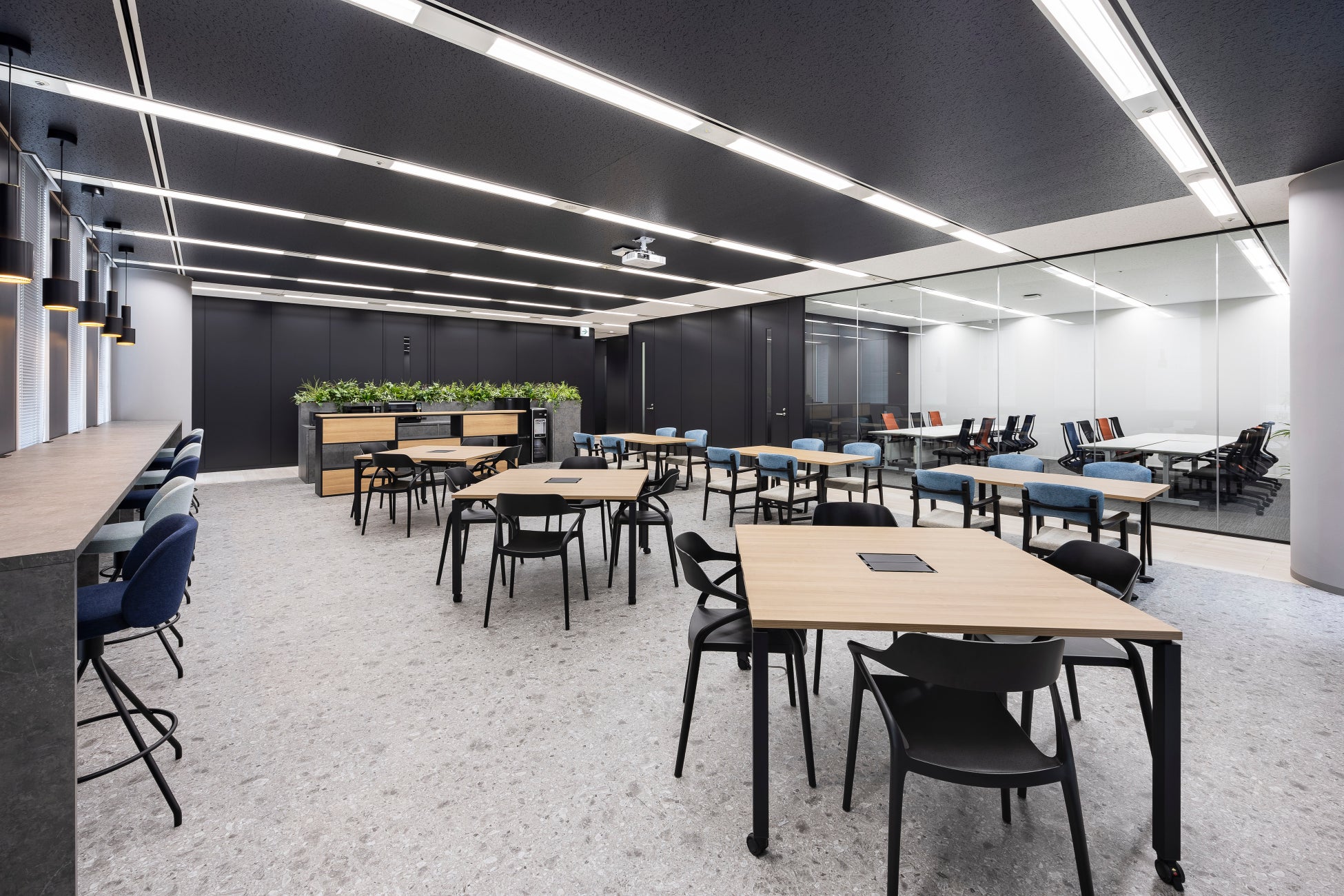 新オフィスは2フロアにわたり、用途別に社員が効率的に働ける場所を自身で選べるようになりました。執務室ではフリーアドレスを採用し、チームでの議論が活発に行えるスペースや、個々が集中して業務に取り組めるレイアウトに一新しました。会議室は対面会議だけでなく、顧客とのリモート会議も快適に行える設備を整えております。さらに、リフレッシュスペースを拡大し、社員同士の交流や弊社の社員が主催する社内イベントを開催できるようにすることで、チームや職種を越えた交流がさらにできるようになりました。