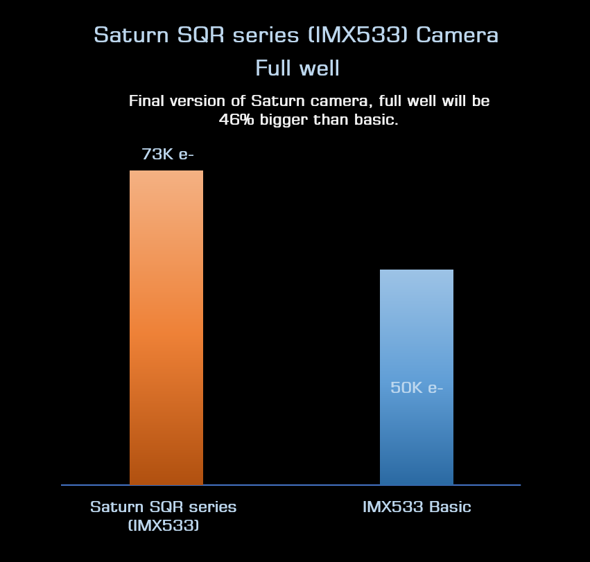 Saturn SQRシリーズに使用されているIMX533センサーの飽和電荷容量(Full Well)は、Player Oneの独自技術とチューニングにより、カタログスペック上の50,000e-を大幅に上回る73,000e-を実現しています。低ゲイン時により飽和しにくく、明度差の大きい天体でハイダイナミックレンジの撮影が行なえます。