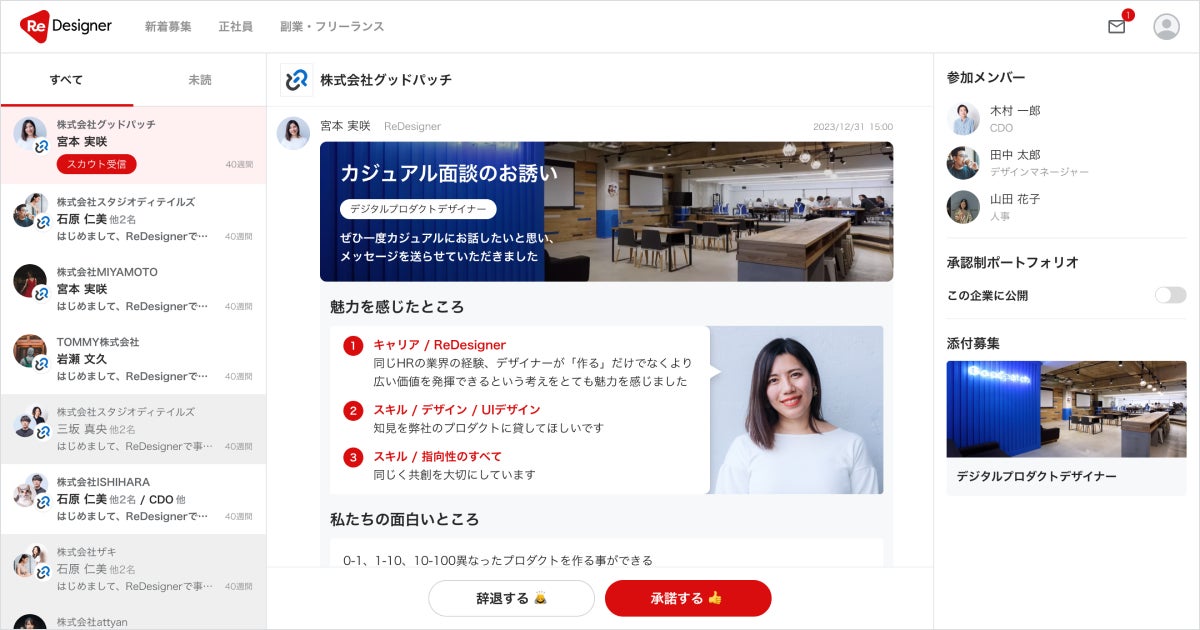 顧客体験を起点に企業変革を前進させるデザインカンパニーの株式会社グッドパッチ(本社:東京都渋谷区、代表取締役社長:土屋尚史、証券コード:7351、以下「グッドパッチ」)が運営するデザイナー特化型キャリア支援サービス「ReDesigner(リデザイナー)」は、スカウトやダイレクトメッセージの送受信ができる新機能を本日公開しました。