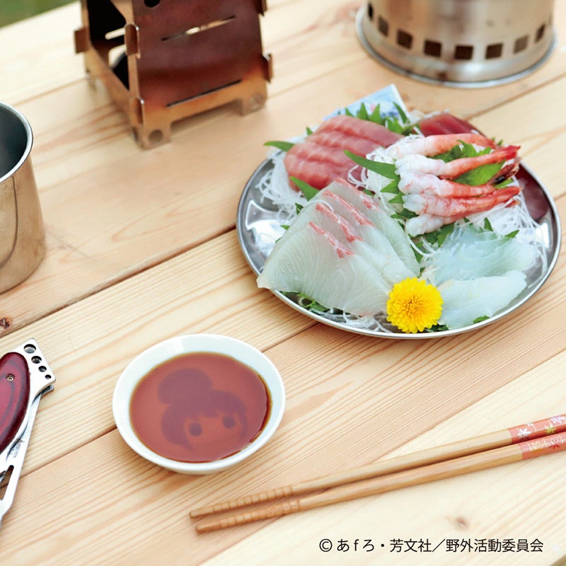志摩リンがデザインされたしょうゆ皿。醤油を注ぐと顔が浮かびあがってきます。