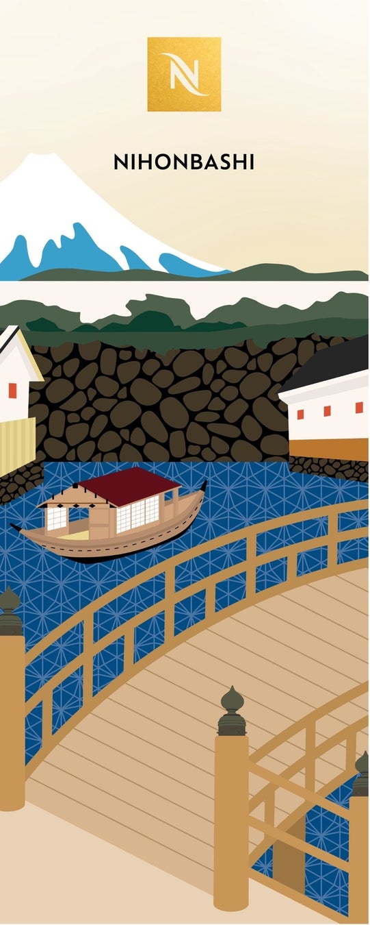 新コンセプトブティック誕生を記念し、ネスプレッソブティック 日本橋髙島屋S.C.店限定のラッピングスリーブで数量限定のコーヒーセットが販売されます。店舗内のデザインにも取り入れている「組子細工」の柄をベースに、日本橋周辺の昔懐かしい情景をイメージしたイラストが描かれています。本コーヒーセットと合わせて、日本橋らしさが溢れるご当地スイーツをお楽しみいただけるセットもあり、お土産やギフトにも最適です。