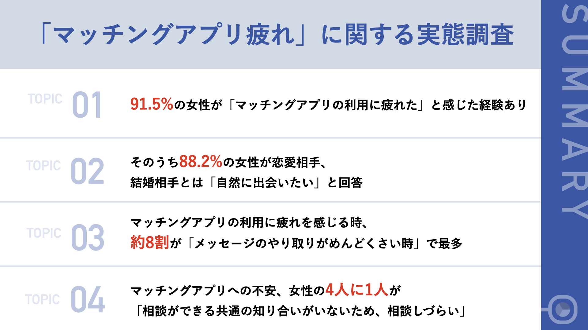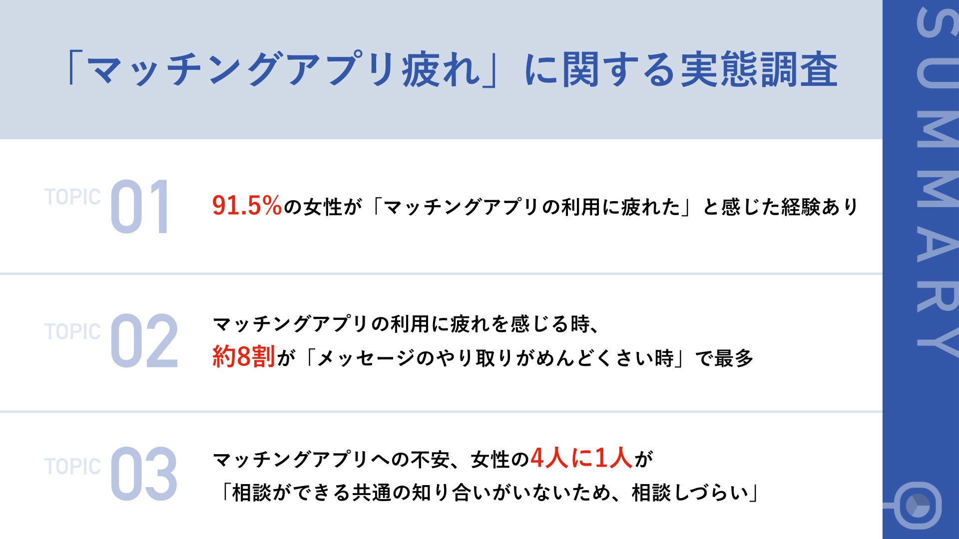 - 91.5%の女性が、「マッチングアプリの利用に疲れた」経験あり