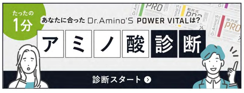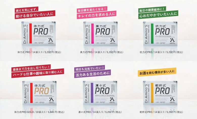 Dr.Amino's「POWER VITAL®」はアミノ酸研究の第一人者である大谷 勝先生と共同開発したサプリメントで、健康・美容に関するお悩みや生活習慣にあわせて、「体力式PRO」「美力式PRO」「抗力式PRO」「凛々式(りりしき)PRO」「乾杯式PRO」「体力式PRO-GOLD」の全6種類をラインナップしております。