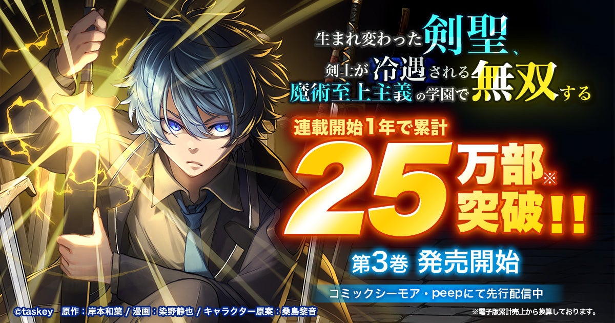 taskey株式会社(本社:東京都新宿区、代表取締役CEO:大石弘務)が発行する、マンガ『生まれ変わった剣聖、剣士が冷遇される魔術至上主義の学園で無双する』(原作:岸本和葉 / 漫画:染野静也 / キャラクター原案:桑島黎音)の累計発行部数が、連載開始約1年で25万部(※)を突破しました。また、本作待望の第3巻目がコミックシーモアにて1月28日(火)に発売開始いたします。