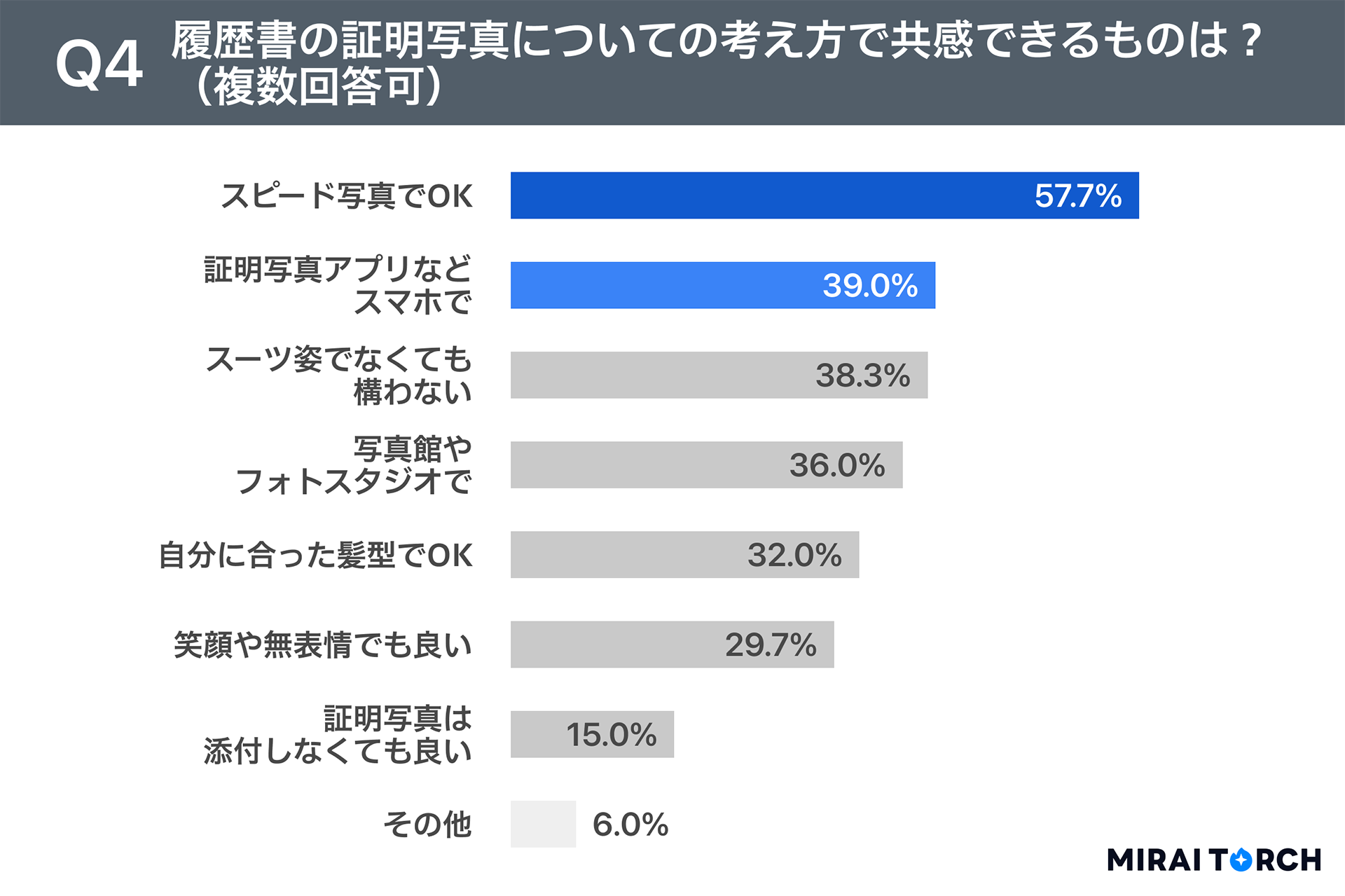 『採用担当者として、履歴書の証明写真についての考え等で共感できるものをお答えください。』という質問に対しては「スピード写真機で証明写真を撮影する」が57.7%、「証明写真アプリなどスマホで撮影する」が39.0%と、写真館やフォトスタジオで証明写真を取らなくてもいいと考える採用担当者が多数占めることがわかりました。