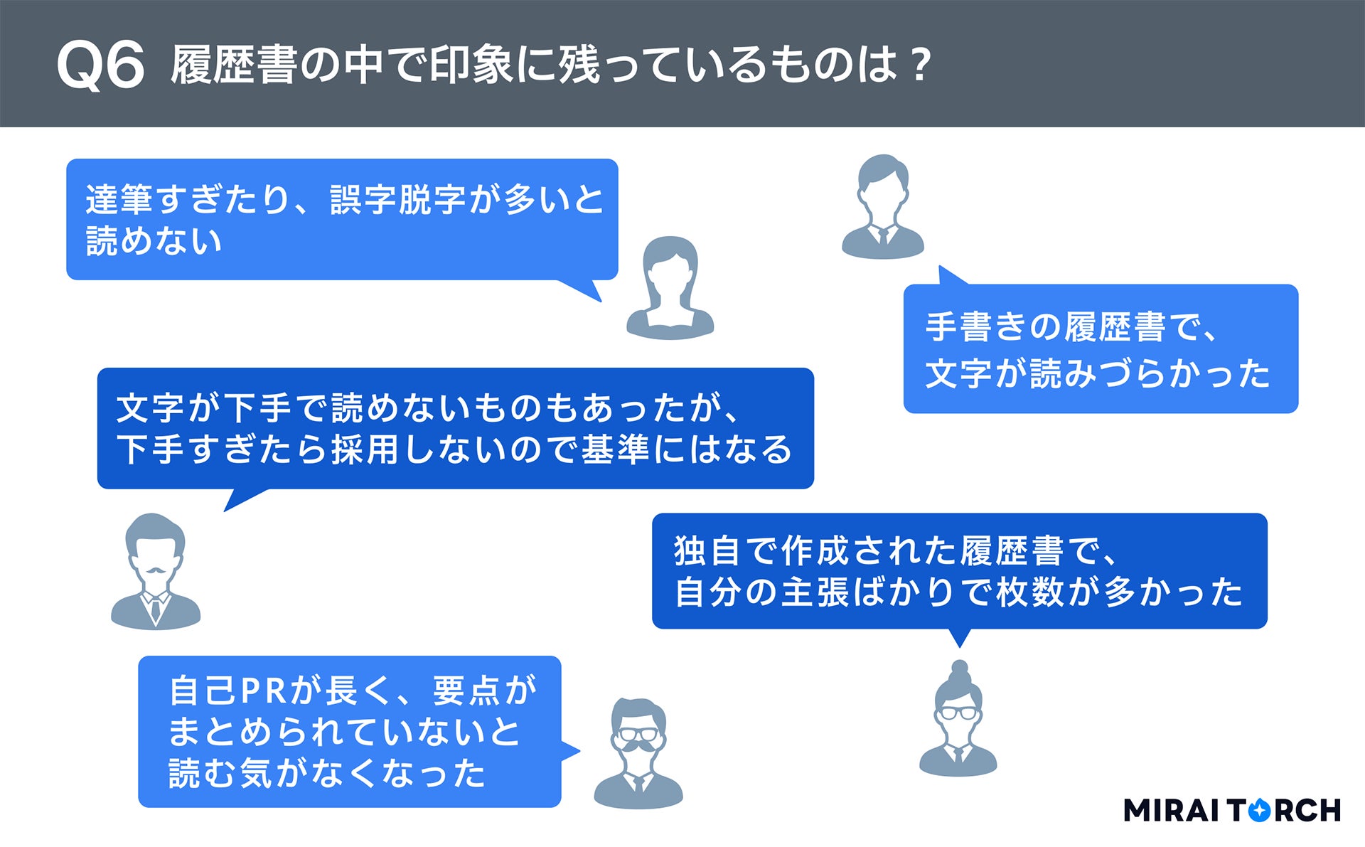 『あなたがこれまで見た「履歴書」の中で印象に残っているものがあればお答えください。』という質問に対しては下記のような結果となりました。「文字が達筆すぎて何が書いてあるのか読めなかった」「自己PRが長く、要点がまとめられていないと読む気がなくなった」などの回答が多く見られました。