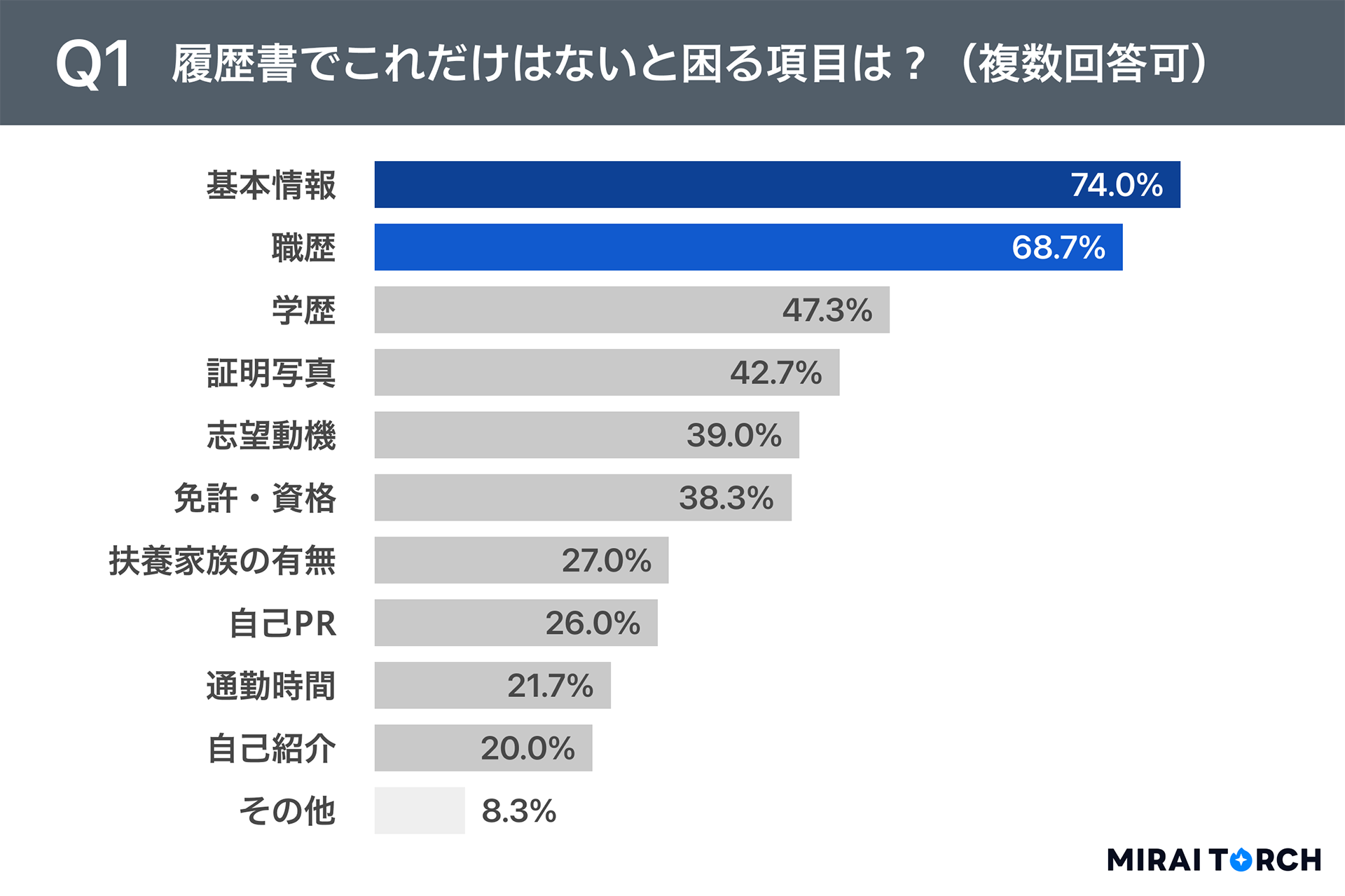 また、『「履歴書」の項目で、これだけはないと困るという項目をすべてお答えください。(複数回答可)』の質問に対しては名前、生年月日、年齢、住所、連絡先、メールアドレスなどの「基本情報」と答えた方が74%。次いで「職歴」68.7%と他の回答と大きく差を広げるかたちとなりました。