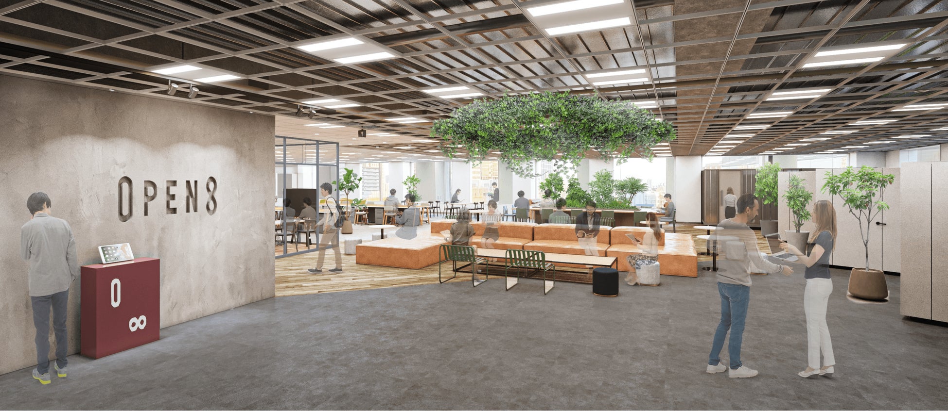 新オフィスは、南からの明るい光を豊かに取り込むエントランスラウンジがワーキングスペースも兼ねており、オフィスワークするメンバーたち、そしてオープンエイトを訪れる皆様がカジュアルにコミュニケーションを図れるコミュニティスペースとしてデザインされています。また、遮音性に優れた個人ブースを多数備え、快適なオンラインミーティング環境も実現しました。効率的に業務を推進する場であることに加え、コミュニケーションを通じた共創の場として、オフィスが要石の役割を果たしていきます。