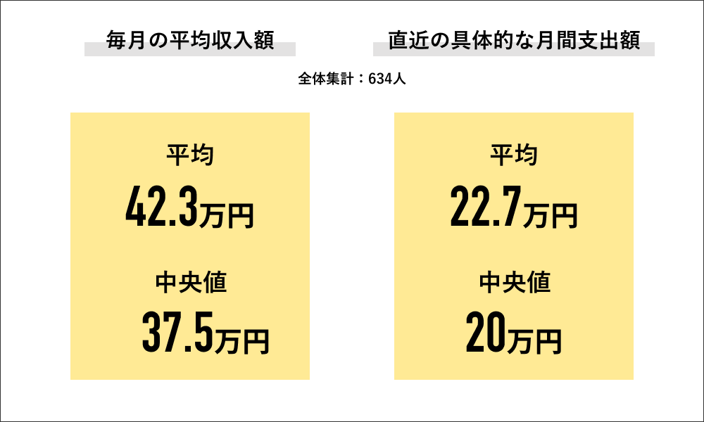 毎月の収入額は全体平均42.3万円で中央値は37.5万円に対し、毎月の支出額は全体平均22.7万円で中央値は20万円で、平均と中央値共に収入額が約20万円高い結果になりました。
