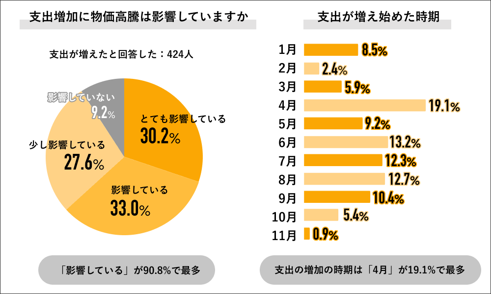 また、支出額が増え始めたことを実感し始めた時期を聞くと、「4月」が19.1%で最多回答になり、次いで「6月」が13.2%、「8月」が12.7%、「7月」が12.3%、「9月」が10.4%で上位5つの回答結果でした。