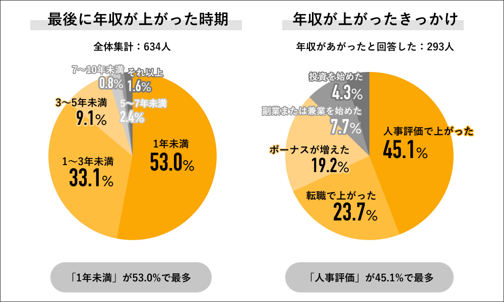 また、年収が上がったきっかけでは「人事評価で上がった」が45.1%で最多回答になり、次いで「転職で上がった」が23.7%、「ボーナスが増えた」が19.2%で上位3つの回答結果になりました。