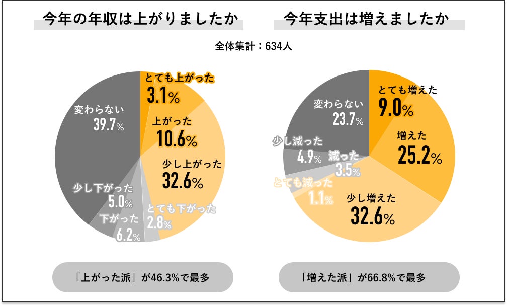 今年の収入の増減では、「とても上がった」3.1%、「上がった」10.6%、「少し上がった」32.6%を合算した46.3%が”上がった派”の回答をした一方、今年の支出増減では「とても増えた」9.0%、「増えた」25.2%、「少し増えた」32.6%を合算した66.8%が”増えた派”の回答をしました。