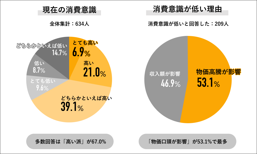 現在の消費意識(購買意欲)を聞くと「とても高い」6.9%、「高い」21.0%、「どちらかといえば高い」39.1%を合算した67.0%が”高い派”の回答をしました。また”低い派”の回答をした33.0%の理由では、53.1%が「物価高騰が影響」と回答し、「収入額が影響」と回答したのは46.9%でした。