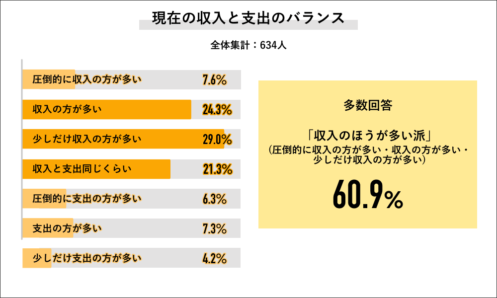 現在の収入と支出のバランスについては「圧倒的に収入の方が多い」7.6%、「収入の方が多い」24.3%、「少しだけ収入の方が多い」29.0%を合算した60.9%が”収入の方が多い派”に回答しました。