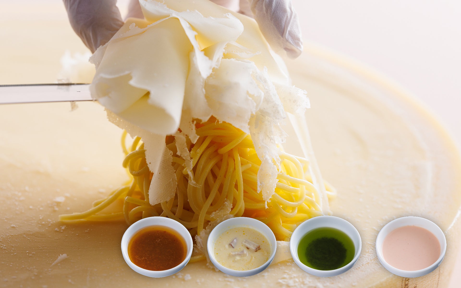 茹でたての生麺パスタを、お好みのソースで和えてトッピングでお召しあがりいただけます。