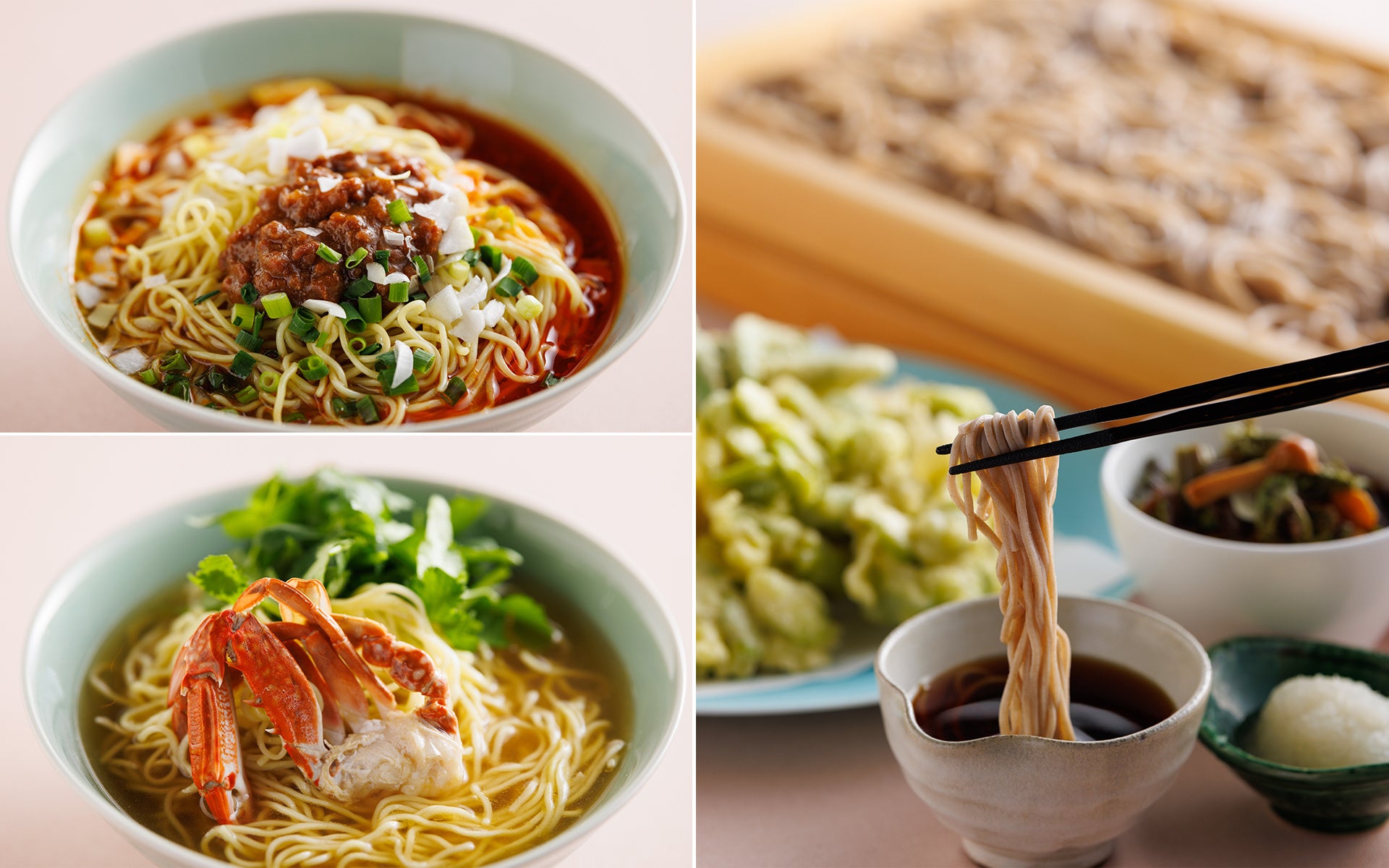 冷やし日本蕎麦は、揚げたての春野菜の天ぷら、山菜と共にお召し上がりいただけます。
