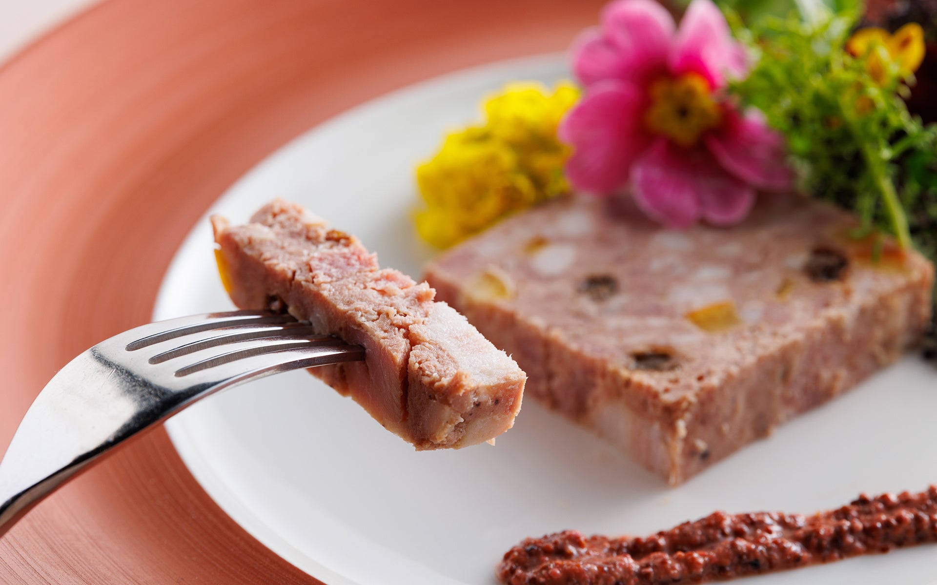 豚肉・鶏肉やレバーなどの田舎風ミートローフは、オレンジピールとレーズンが入り、ハーブが爽やかに香ります。