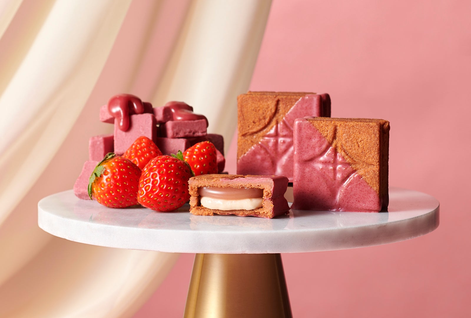 福岡県産あまおう苺を使った苺バターキャラメルに、香りと風味のバランスがよい、カカオ分70%のクーベルチュールから作られたショコラバタークリームを挟むことで、苺の華やかな甘さにショコラの濃厚な香ばしさが合わさる心地よい味わいに仕上げました。バレンタインシーズン用にデザインされた、クラシックピンクをベースにデザインされたパッケージもお楽しみください。