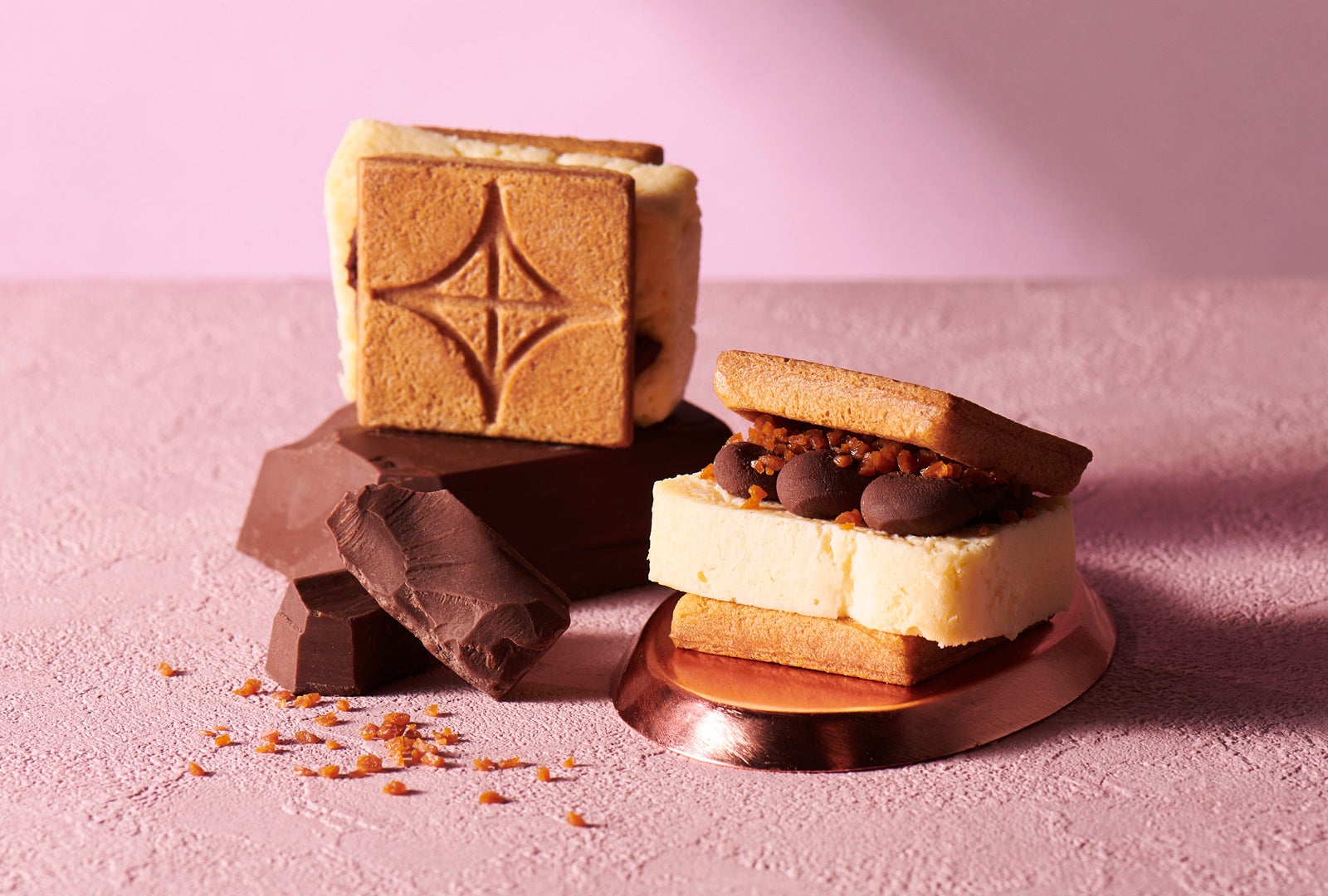 マスカルポーネチーズと北海道産クリームチーズを使用した濃厚なチーズケーキの上に、ベルギー産クーベルチュールチョコレートを使用したチョコレートクリームとキャラメルキャンディをトッピングし、特注のプレス機で焼き上げたサクサクのクッキーで挟みました。バレンタイン期間でのみ味わえる贅沢な一品です。