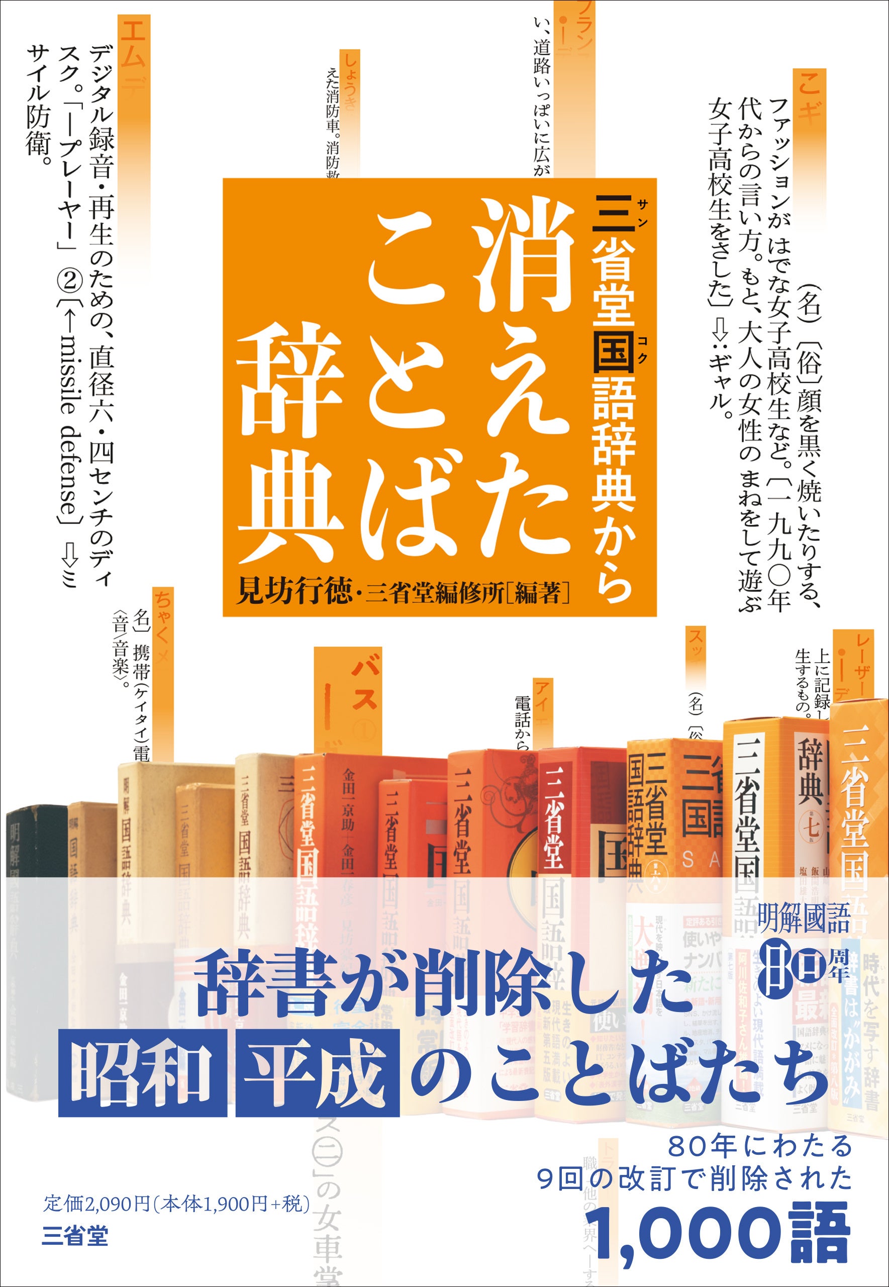 前身となる1943(昭和18)年発刊の『明解国語辞典』以降、2022(令和4)年刊『三省堂国語辞典 第八版』まで、約80年にわたる計9回の改訂で削除された項目から1,000項目を厳選し、当時の紙面をそのまま拡大して五十音順に配列しました。各項目には脚注を付し、削除した版数・年次を明示。「オート三輪(車)」「キーパンチャー」「コギャル」「バスガアル」「メーンエベント」など15項目は活字を大きくし、時代背景や関連語の盛衰を特記。耳馴染みのない言葉の理解を助ける、描き下ろしの挿絵50点。巻末ではさらに1,000項目を紹介して計2,000の削除語を古い版数順に一挙掲載。若者からシニアまで、驚きとなつかしさに満ちた昭和レトロ/平成レトロのよすがとなる一冊です。