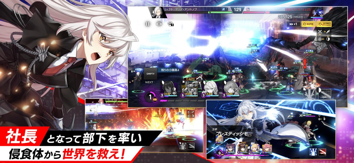 本作のバトルは、編成した「小隊」を指揮し、自陣を守りながら敵の本陣を破壊する、オフェンス方式のリアルタイムラインバトルで進行します。キャラクター育成はもちろん、リアルタイムPvPやレイドなどのPvEコンテンツも搭載し、リアルタイムストラテジー/シミュレーション要素と、育成型RPGの要素を兼ね備えたタイトルとなっています。