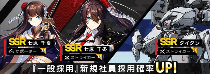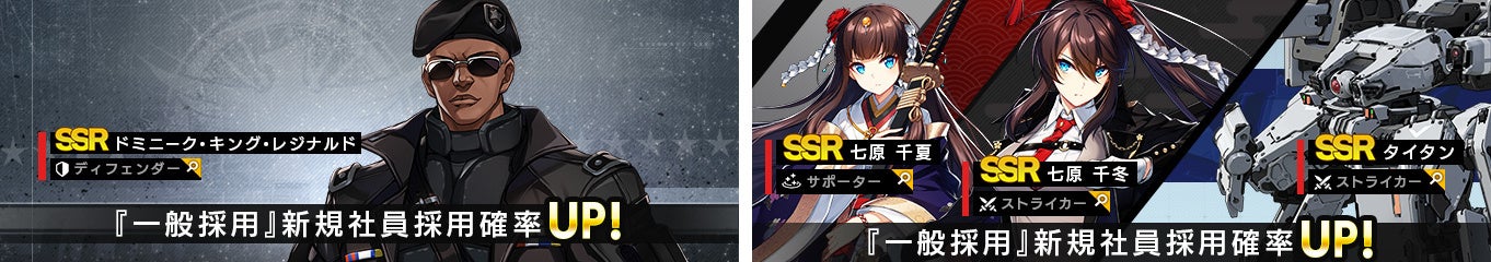 新SSR「ドミニーク・キング・レジナルド」を実装し、同キャラクターの排出確率がアップするピックアップ採用(ガチャ)ならびに既存SSR「七原千冬」「七原千夏」「タイタン」の3キャラクターのピックアップ採用(ガチャ)をそれぞれ開始いたしました。