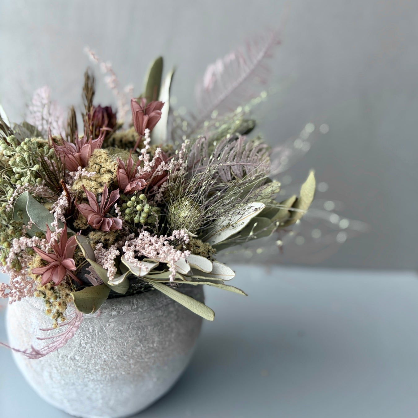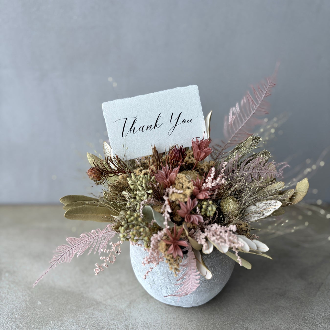 ドライフラワーならではのアンティークなピンクの色合いは、可愛くなりすぎず、優しい華やかさを演出します。